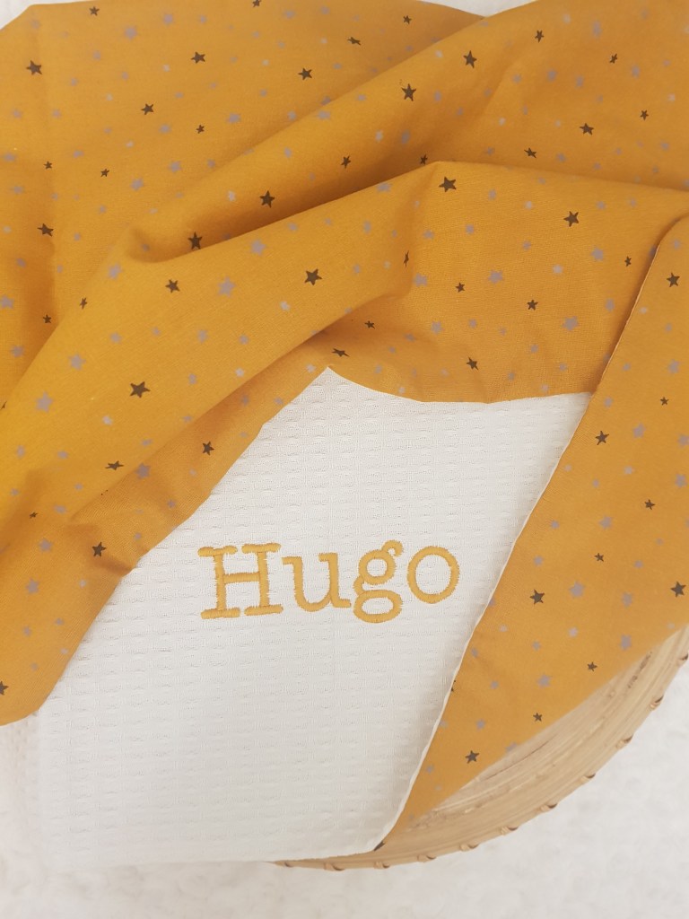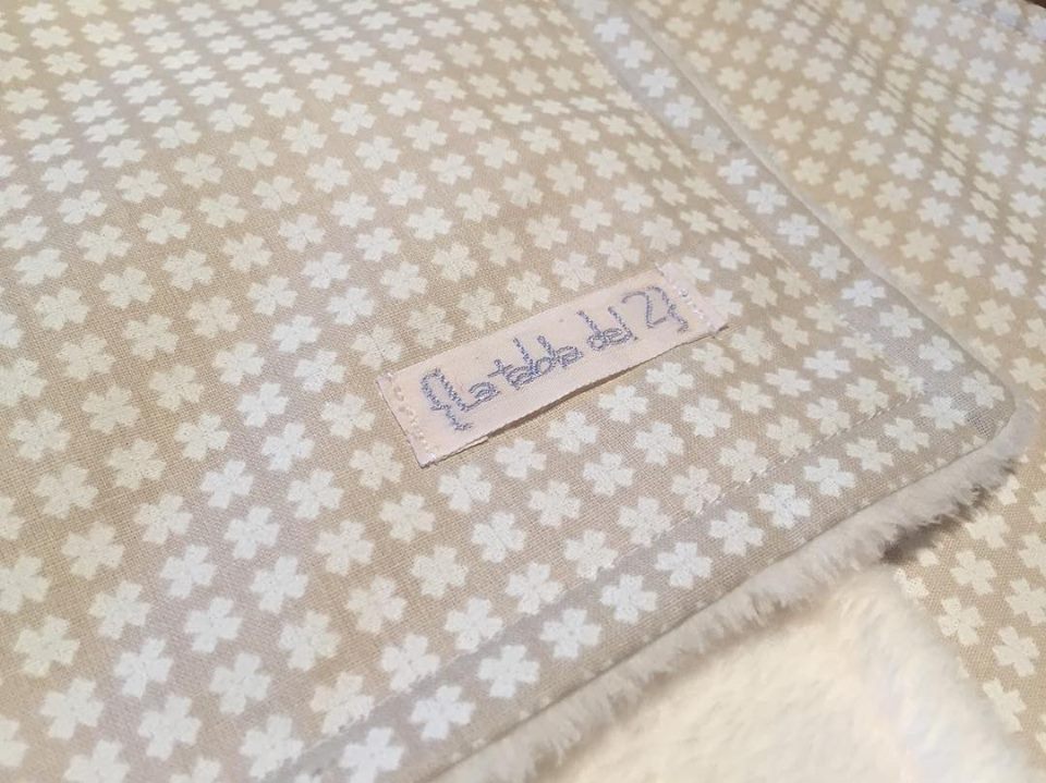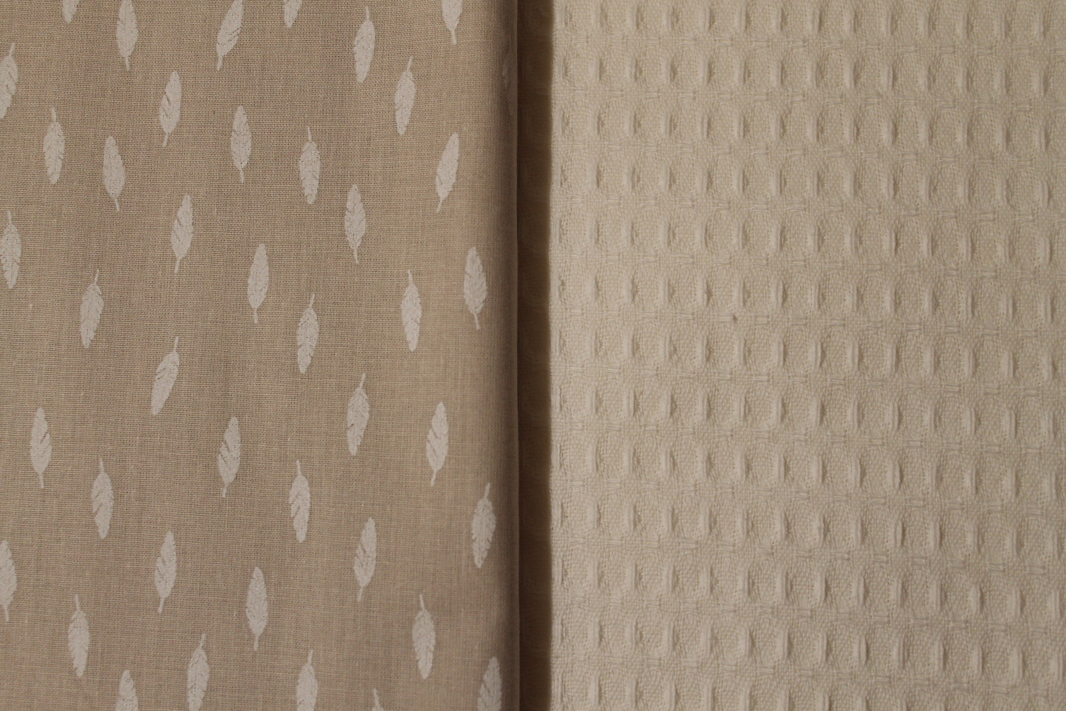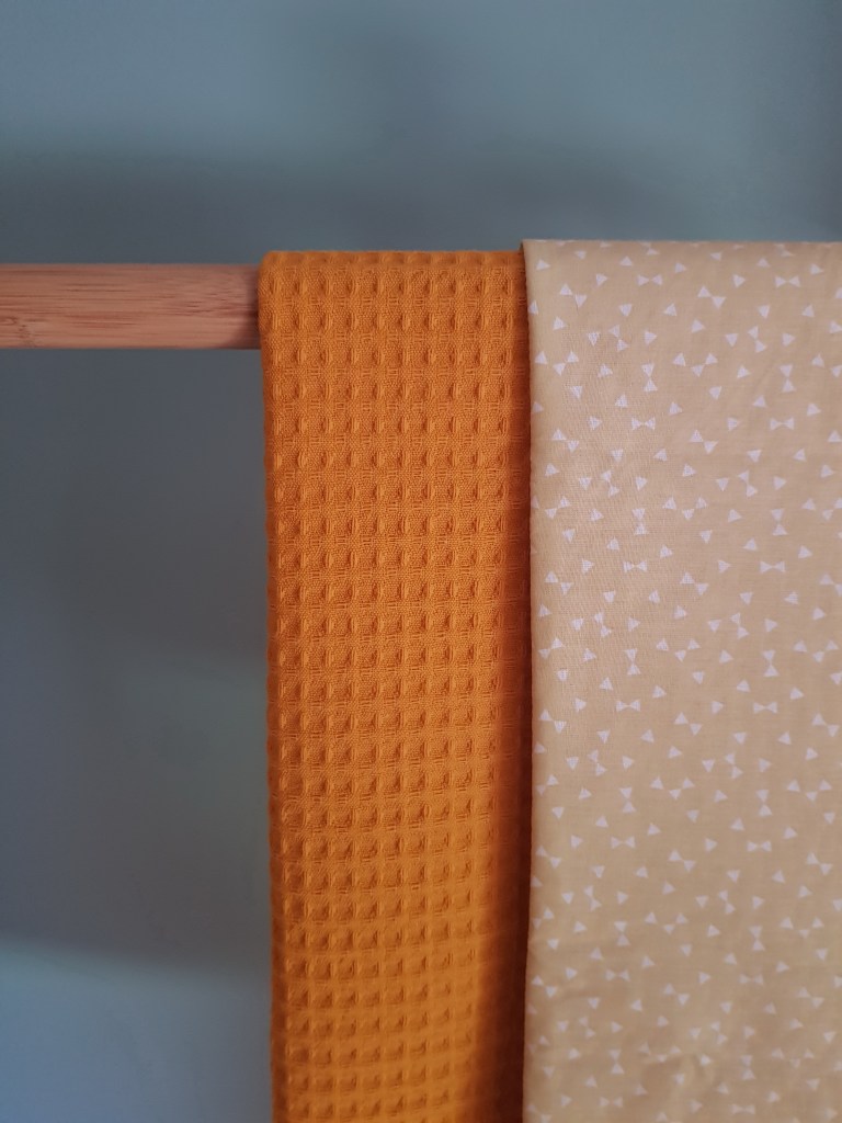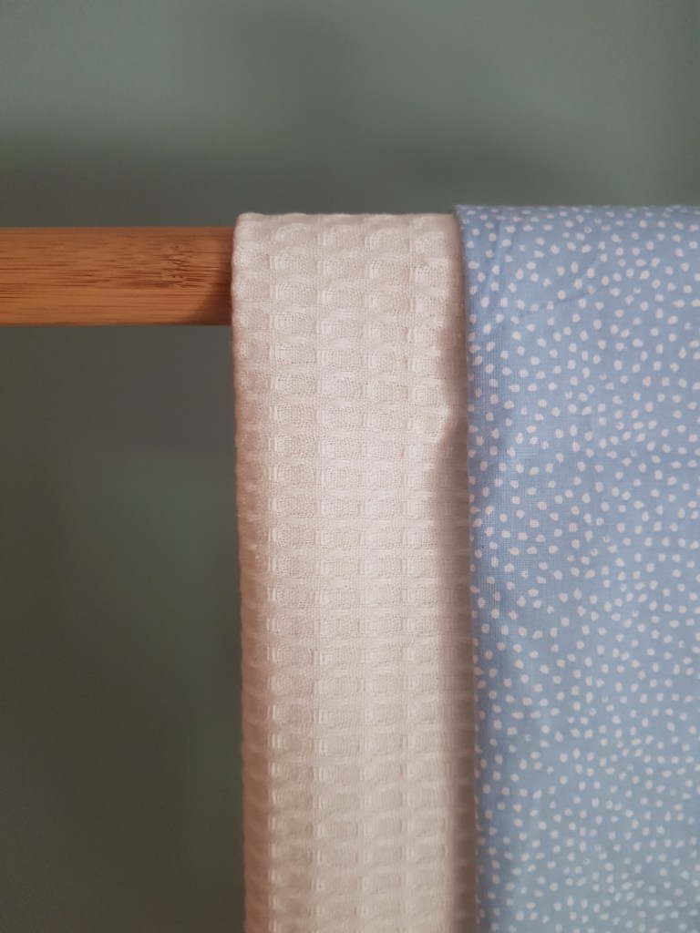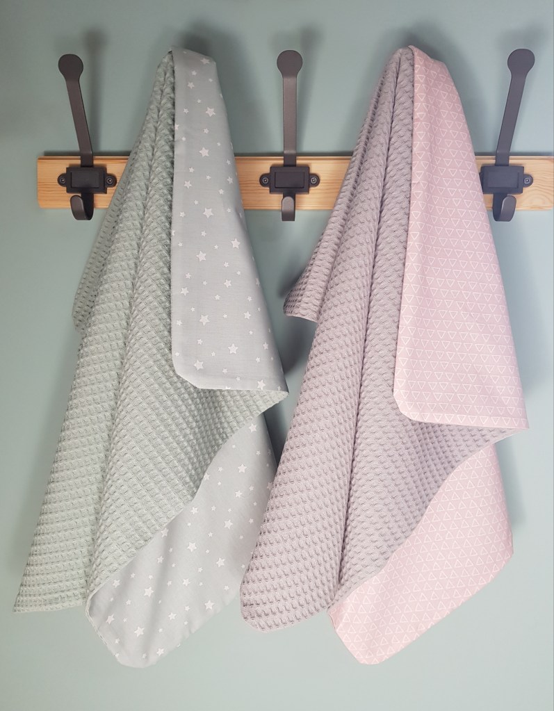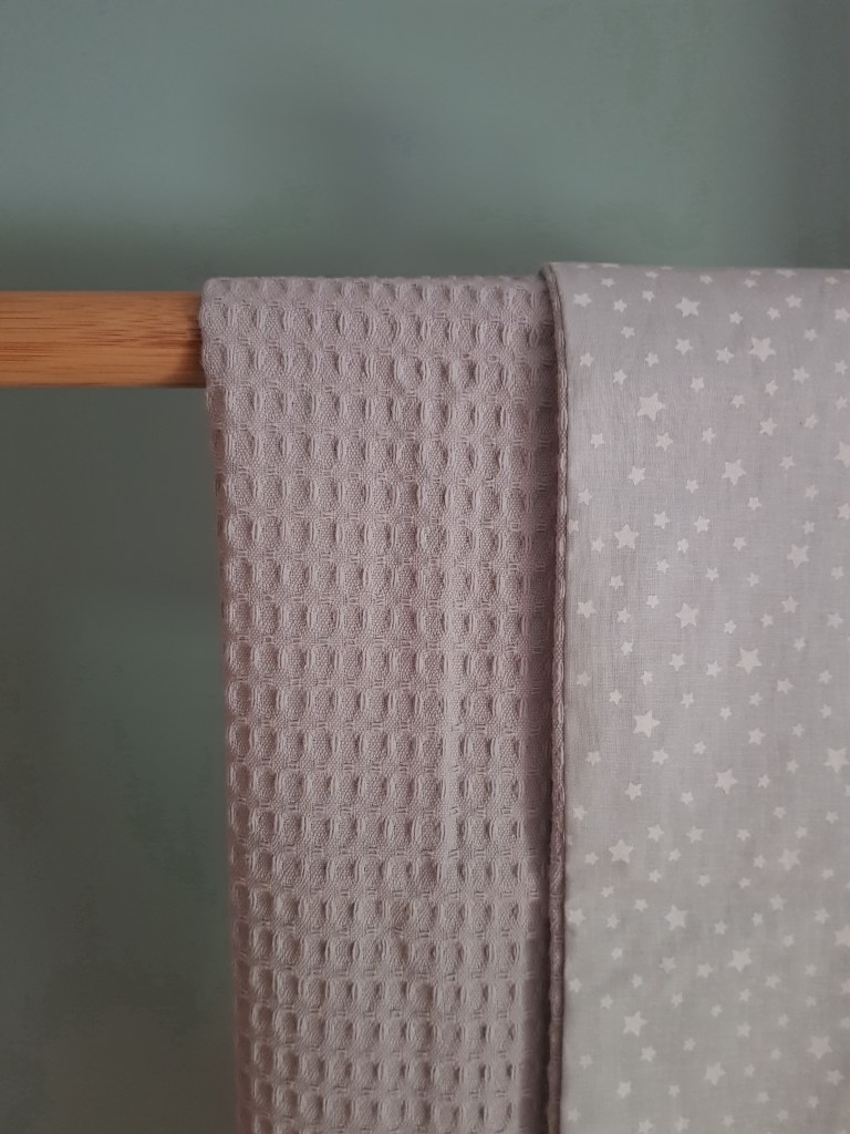 Por un lado estampado de algodón a elegir y por el otro tela gofre.