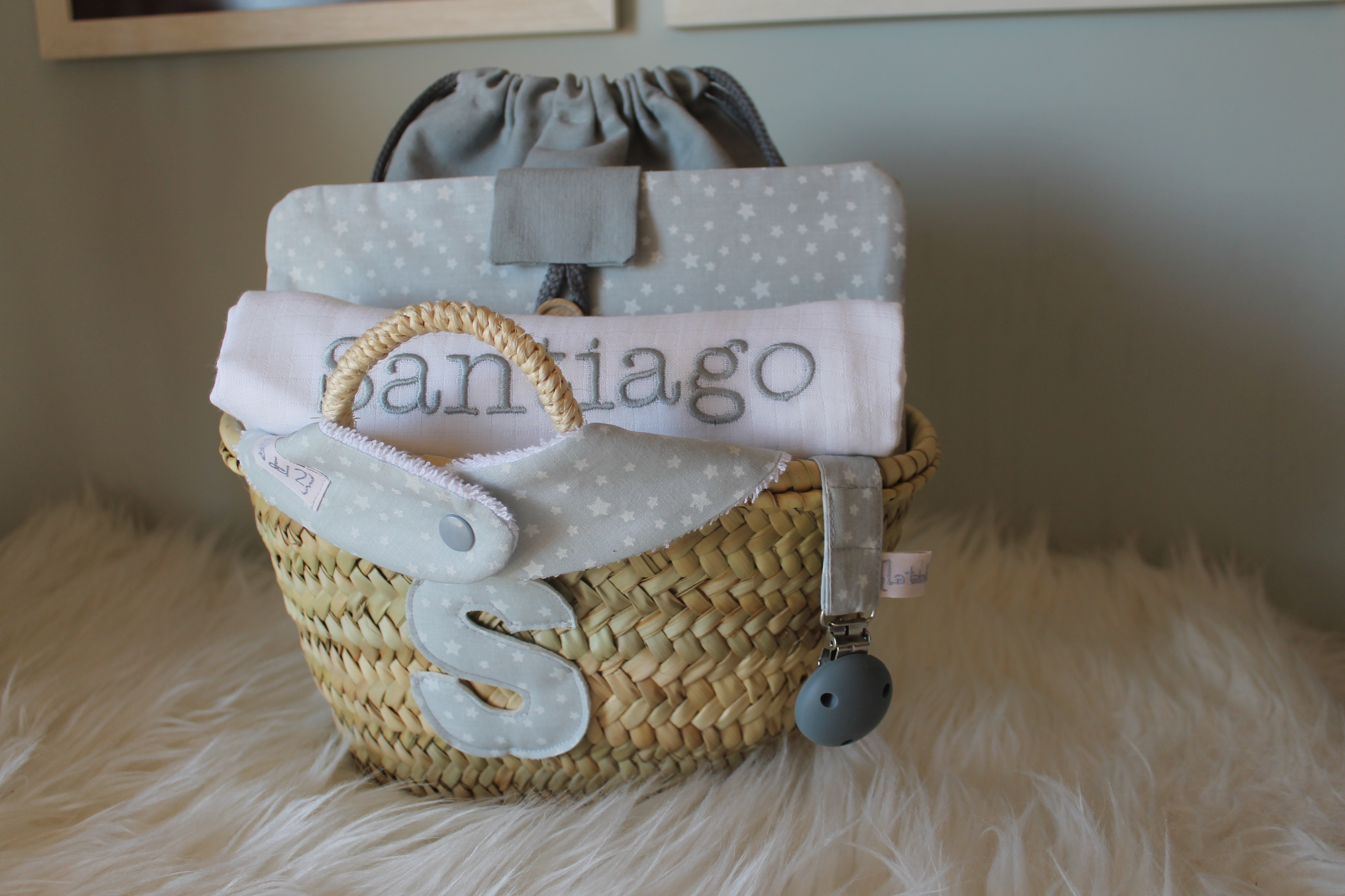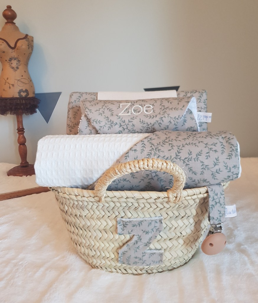 A elegir entre dos tamaños: capazo S y capazo M hechos a mano, de fibras vegetales naturales y que tienen mil usos. Personalizados con la inicial del bebé y que además de ser preciosos pueden servir posteriormente de almacenaje de juguetes, para guardar ropa, para decorar la habitación, para salir de paseo al campo….